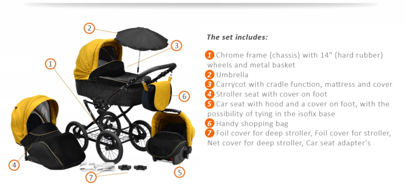 – stroller version with safety barrier and 5-point belts;