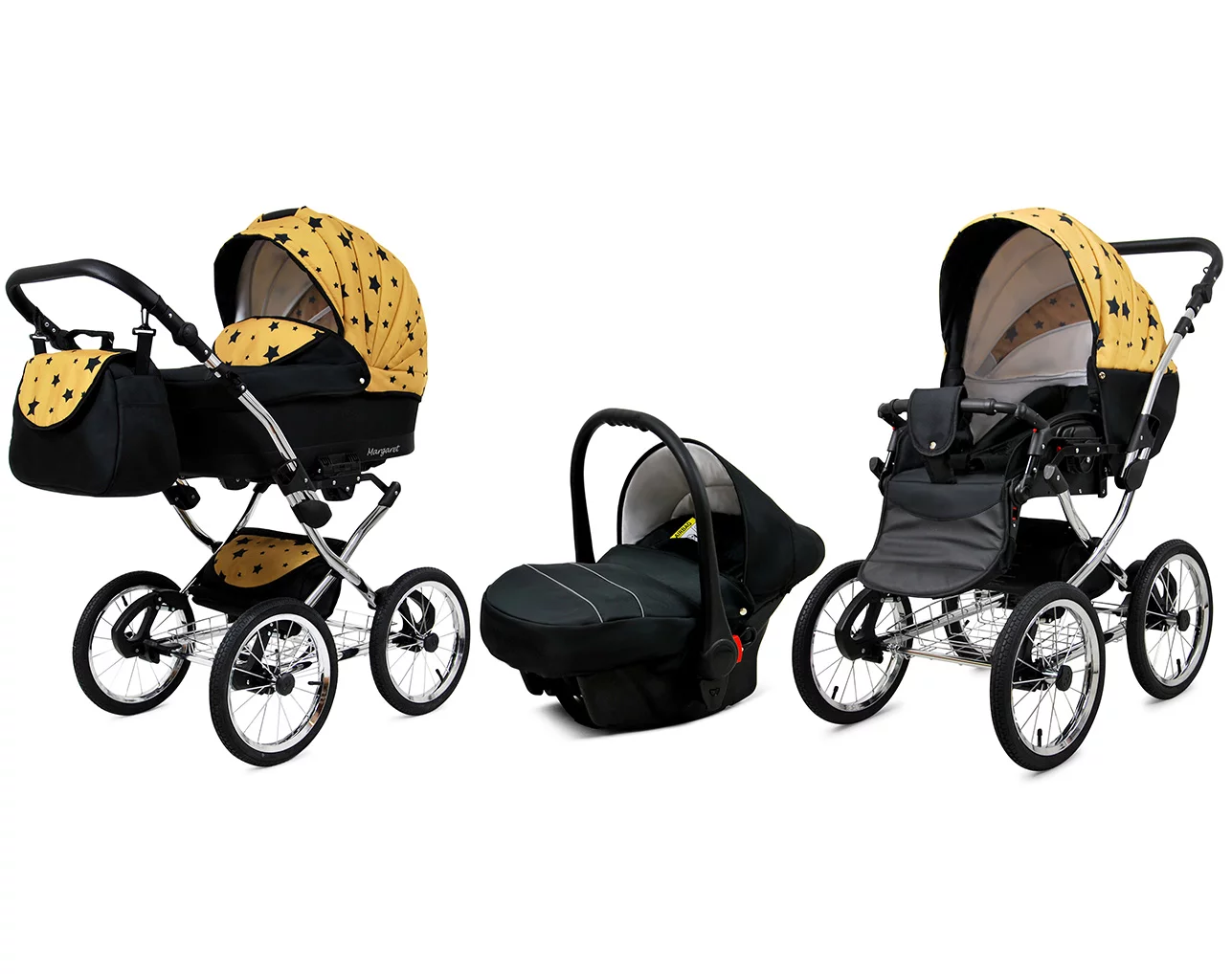 The Margaret Exclusive 3-in-1 Stroller from the renowned European brand BabyLux is a versatile solution for parents. Designed to function as a deep stroller (pram), pushchair, and car seat, it provides ultimate convenience by allowing the car seat to be mounted on the stroller frame.