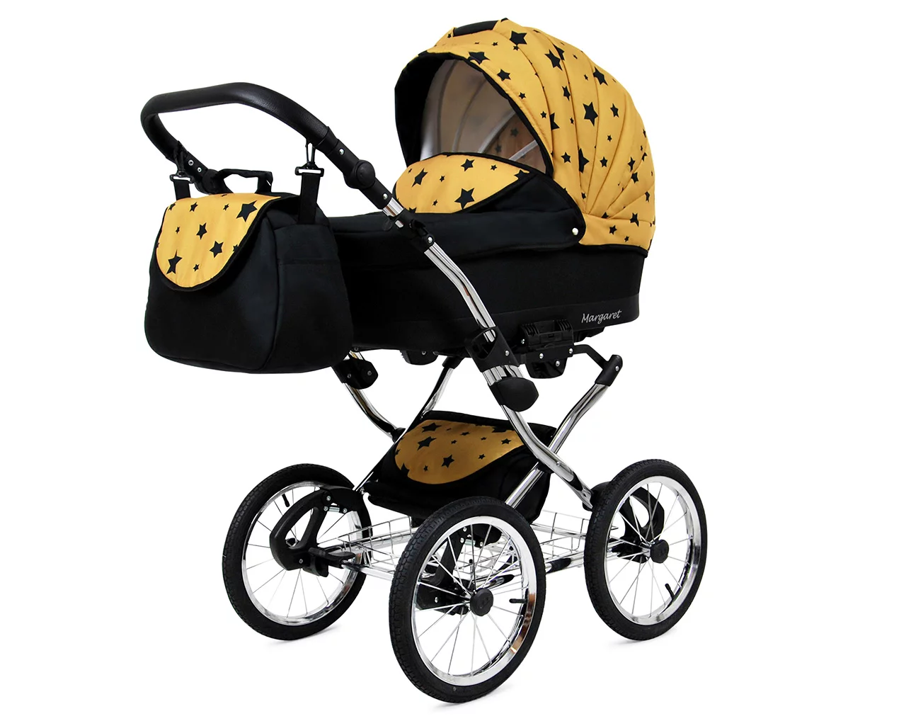 Designed for newborns and infants up to 9 kg, the Margaret Exclusive pram features a lightweight aluminum frame with a foldable canopy and soft cotton lining, ensuring maximum comfort and ventilation.