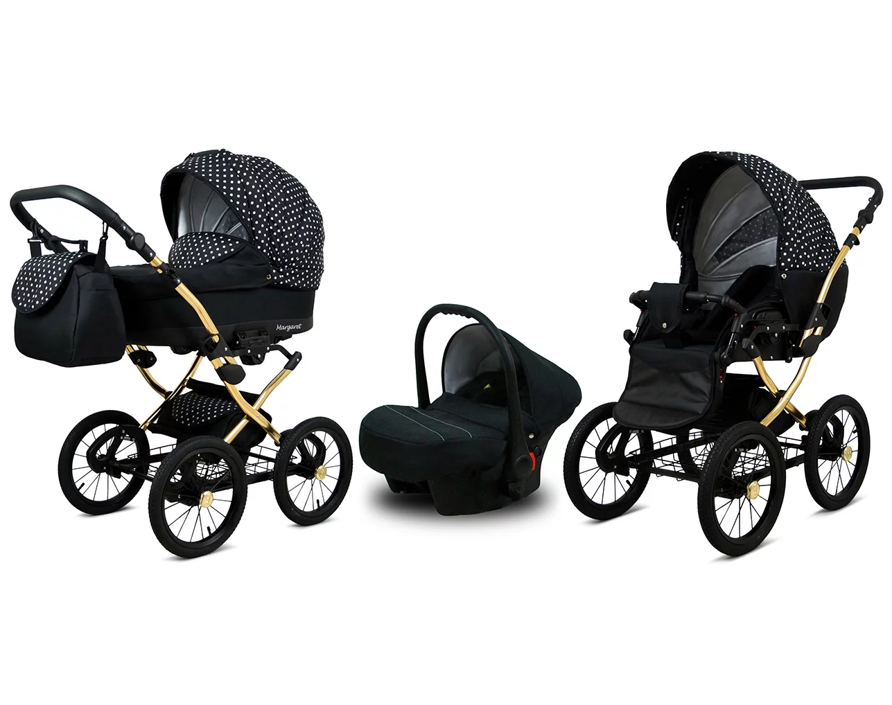 The Margaret Gold 3-in-1 Stroller from the renowned European brand BabyLux is a versatile solution for parents. Designed to function as a deep stroller (pram), pushchair, and car seat, it provides ultimate convenience by allowing the car seat to be mounted on the stroller frame.