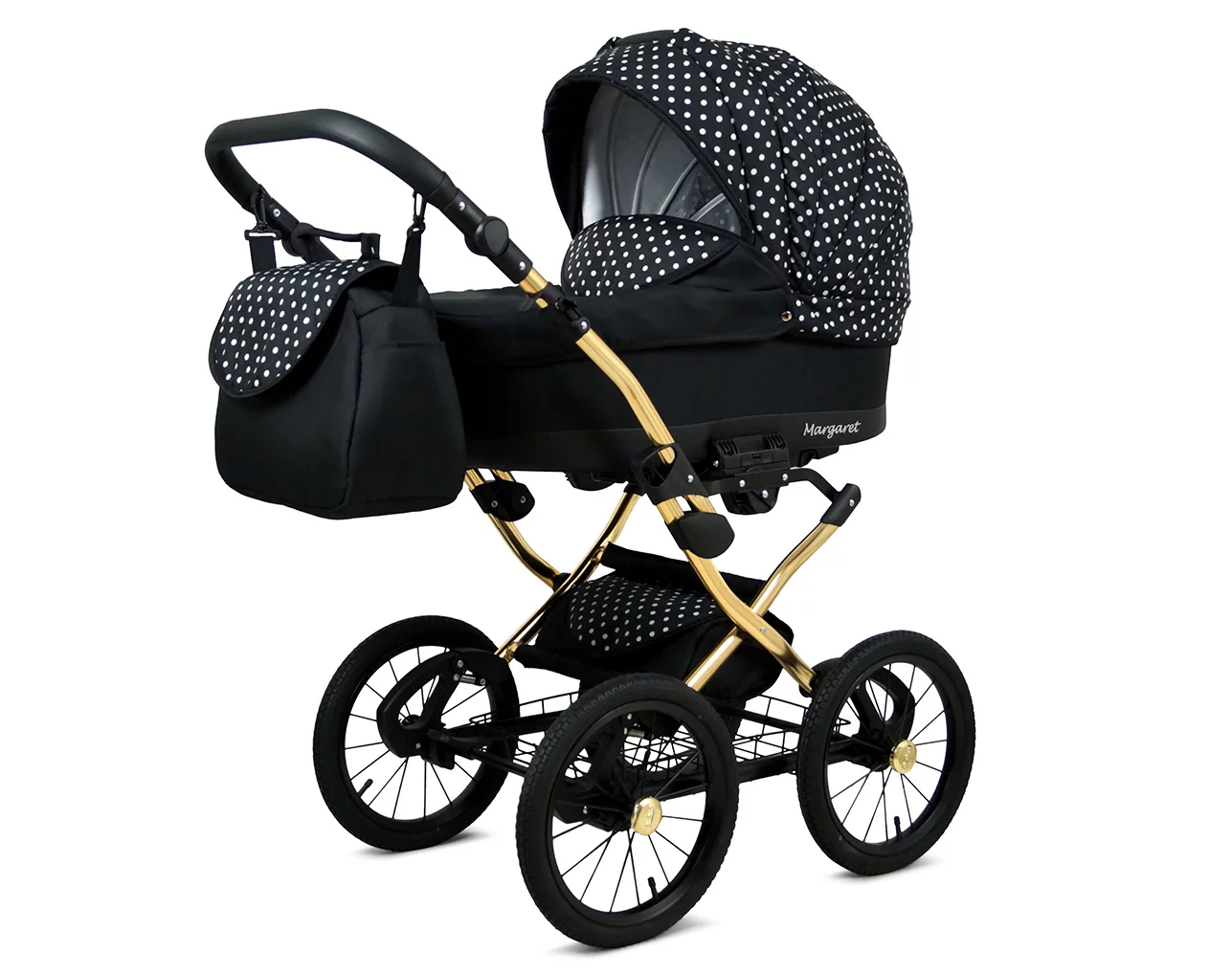Designed for newborns and infants up to 9 kg, the Margaret Gold pram features a lightweight aluminum frame with a foldable canopy and soft cotton lining, ensuring maximum comfort and ventilation.