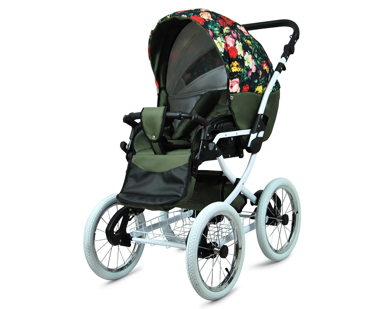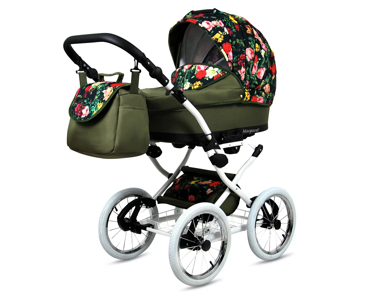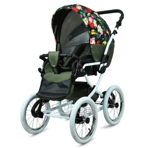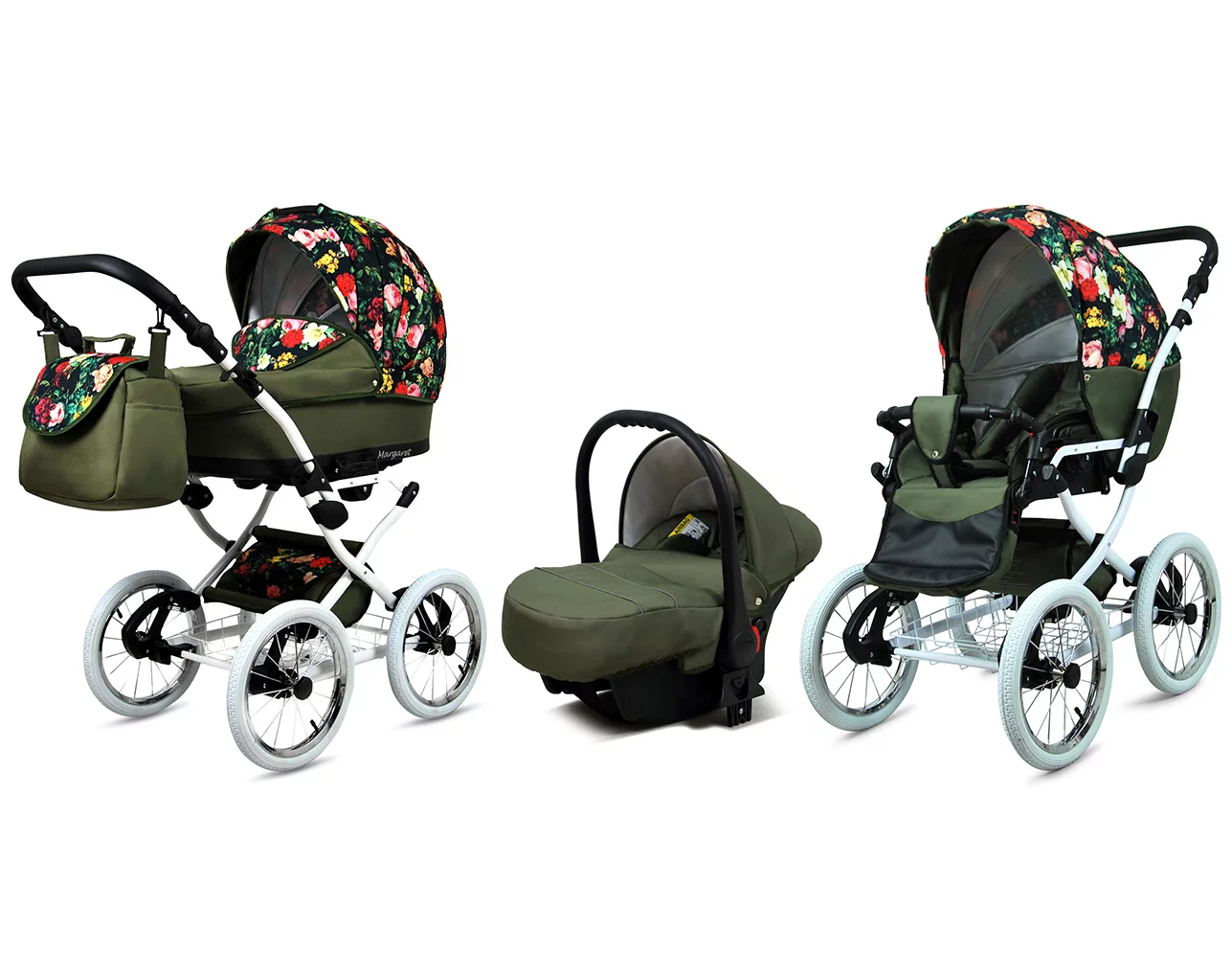 3 in 1 Luxury Stroller and Car Seat – Margaret White Pram Pushchair and Car seat by Babylux- In Roses With Tulips On Black