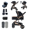 Treat your Newborn with this Ultra Comfortable, Enhanced Safety and Luxury 3 in 1 Baby Pram set in Luxurious Black and Gold. This ultra comfortable baby stroller comes with a large comfortable pram basket, baby car seat , Pram Bag as well as a host of additional baby pram extras. Giving you the most comfortable daily trips , both for your baby and you!.