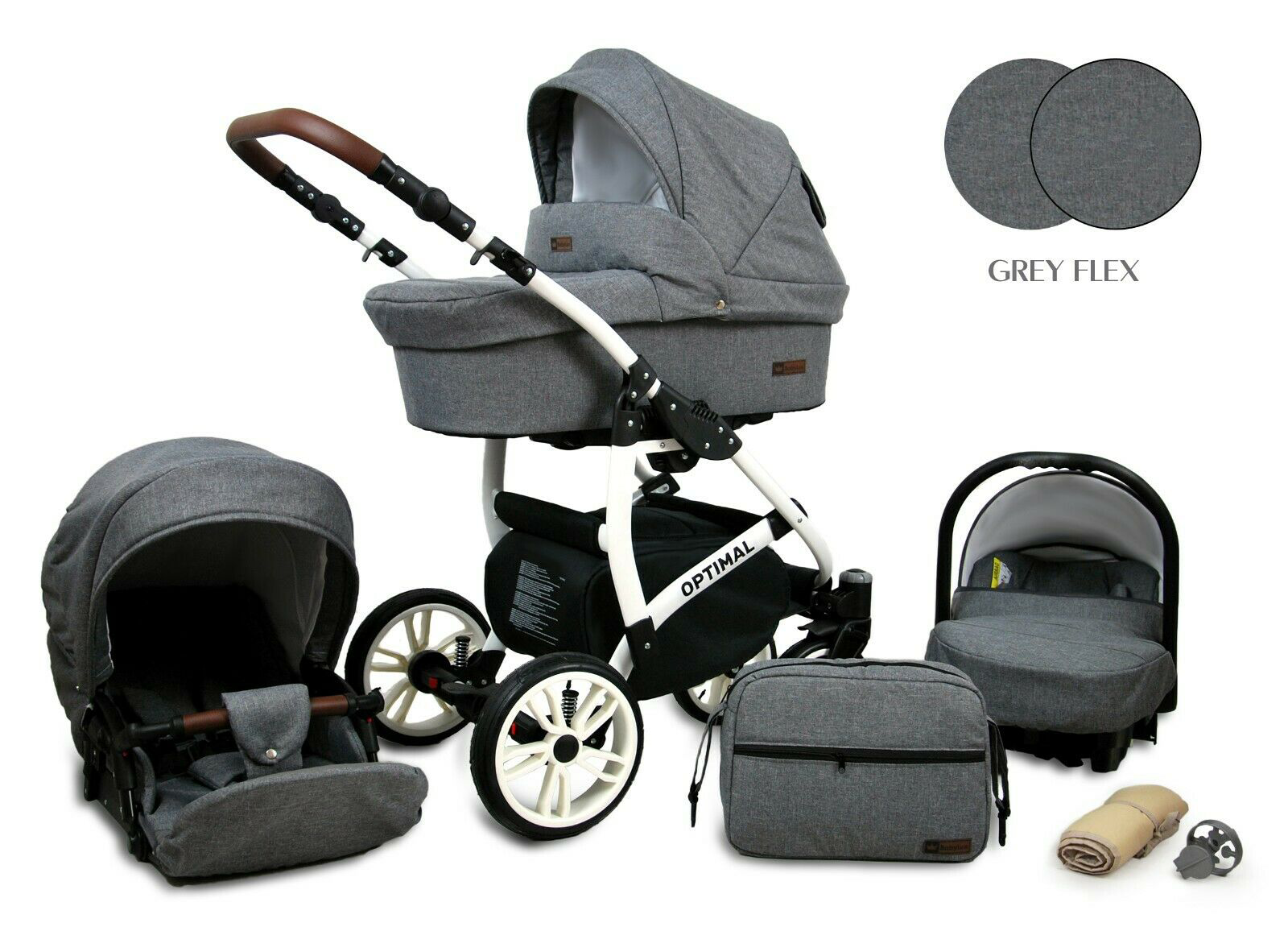 Baby Pram From Birth Pushchair Buggy 3 in1 Travel System Boys Girls ISOFIX BASE – Grey flex -white frame