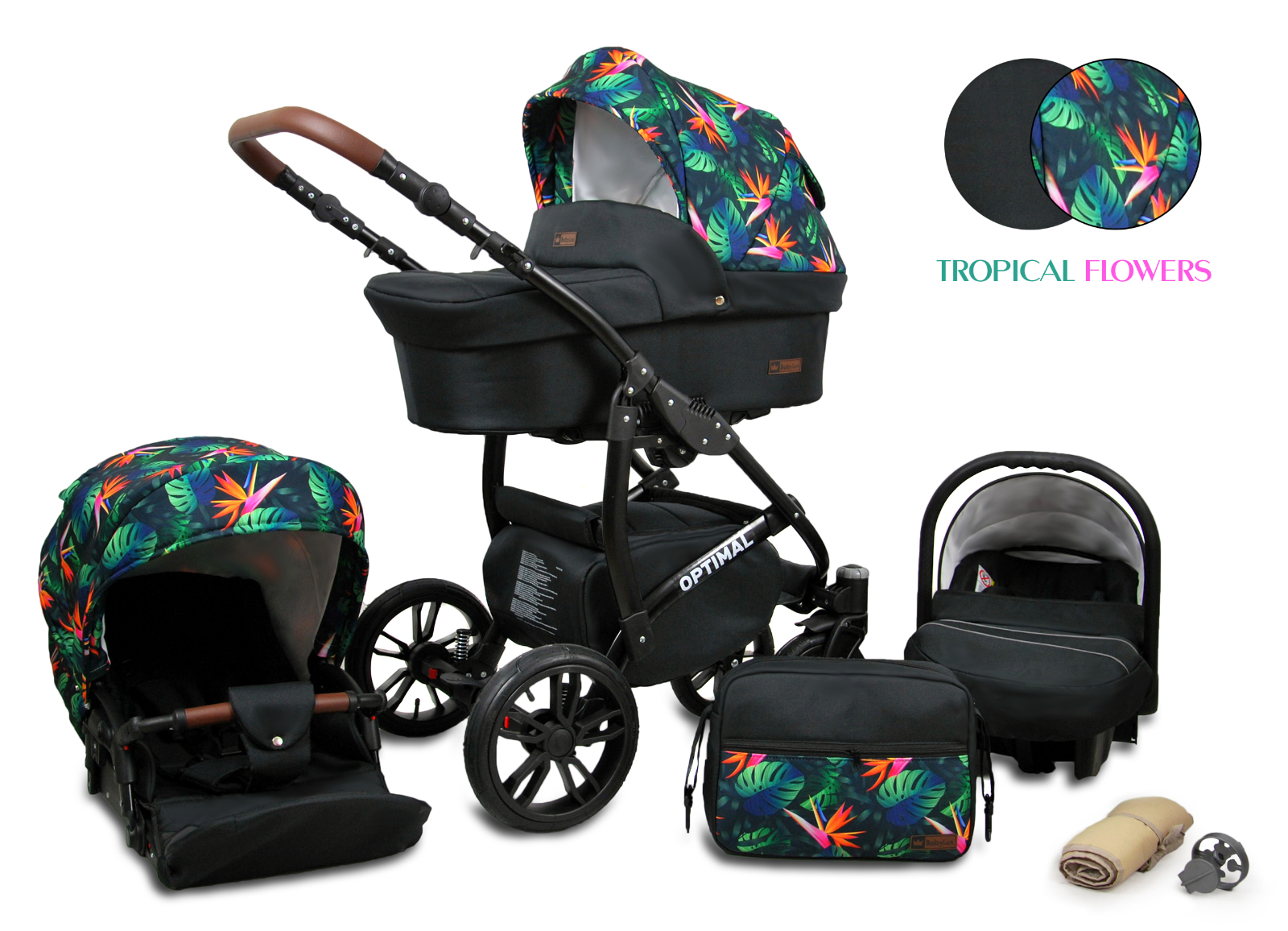 Baby Pram From Birth Pushchair Buggy 3 in1 Travel System Boys Girls ISOFIX BASE -Tropical Flowers – black frame