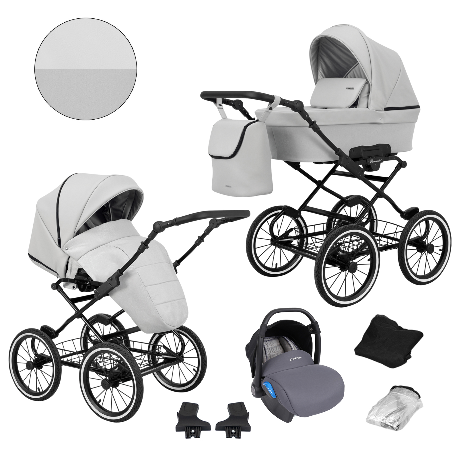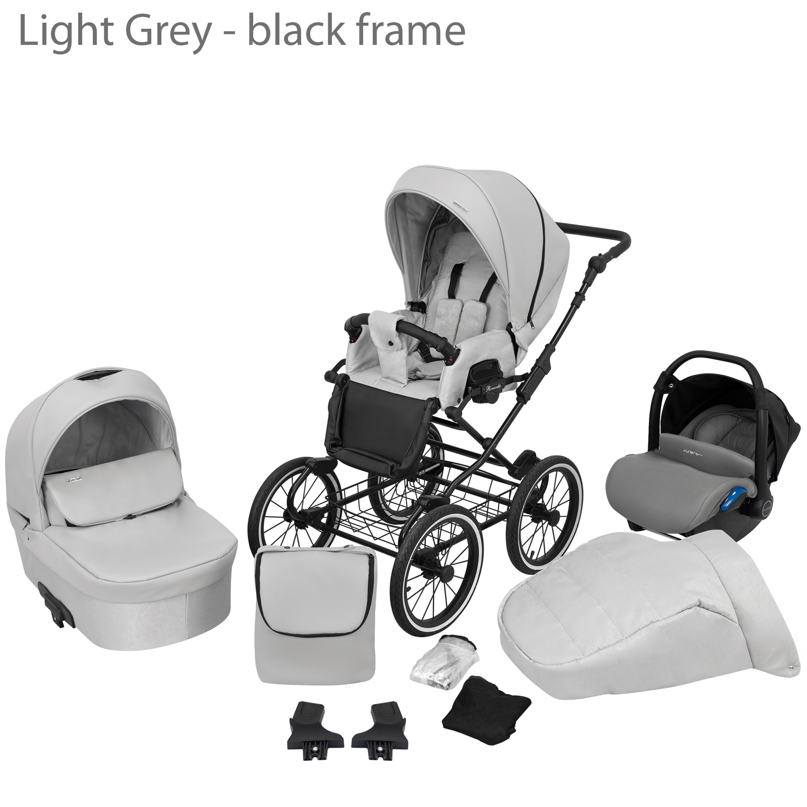Baby Pram Retro Classic Buggy Set 3in1Travel System Eco Leather NEW 2022 -Light Grey (black frame)