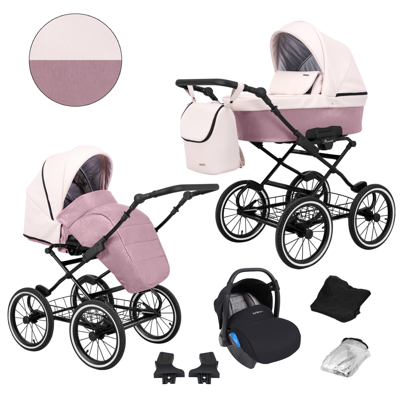 Baby Pram Retro Classic Buggy Set 3in1Travel System Eco Leather NEW 2022 -Pink (black frame)