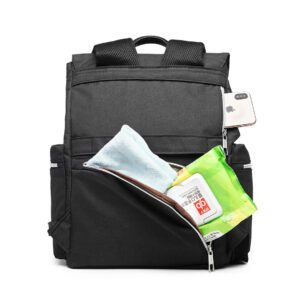 The backpack has a number of external pockets: the front pocket has three insulated slots for bottles and a mesh slot with waterproof lining. There is a side pocket on each side, one has a convenient slot for pulling tissues/wipes through.