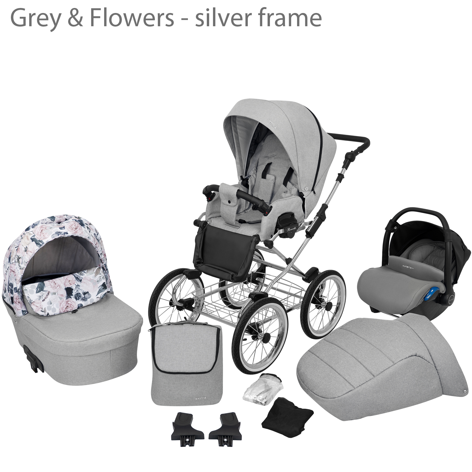 New Baby Pram Retro Set Classic Pushchair 3in1 Travel System Grey & Flower Silver Frame