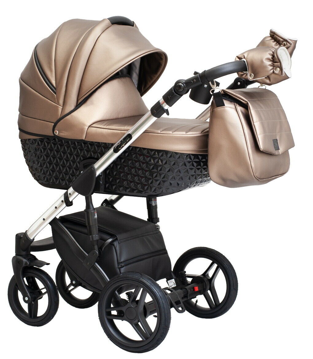 A gondola with a fashionable structure available in 3 color variants: gold, silver, and black. It is light and easy to use Design, durable structure made of aluminum with removable wheels, so you can completely disassemble the stroller for small dimensions Frame with side cutters, available in 2 colors – silver-black and gold-black. An easy and practical system of folding the frame to the small size – to the “0” position. 3 pairs of shock absorbers with adjustable suspension hardness, which increases the comfort of your child’s ride. The upholstery of the gondola booth and the walking seat have large, practical ventilation and a fold-out sun canopy. Extremely spacious and comfortable gondola (length 85 cm) with an intuitive and comfortable headrest lifting system, and a ventilation system on the bottom.