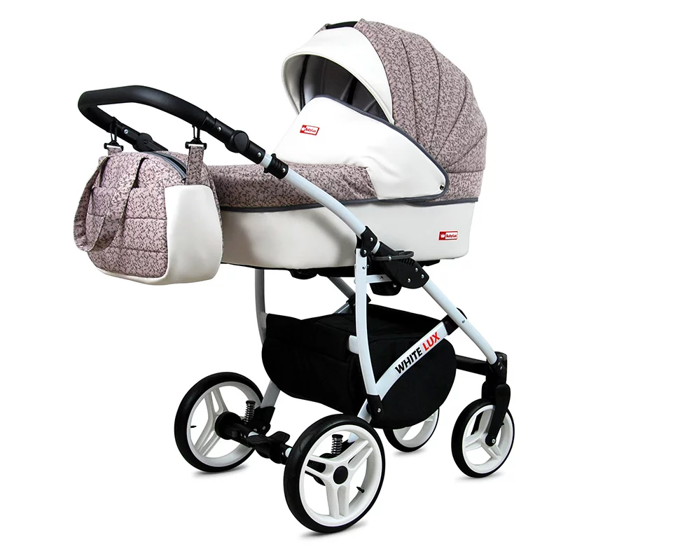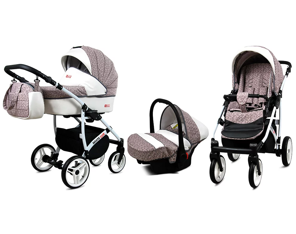 3 in 1 Luxury Stroller and Car Seat – White Lux Pram Pushchair and Car seat by Babylux- In Coral Art